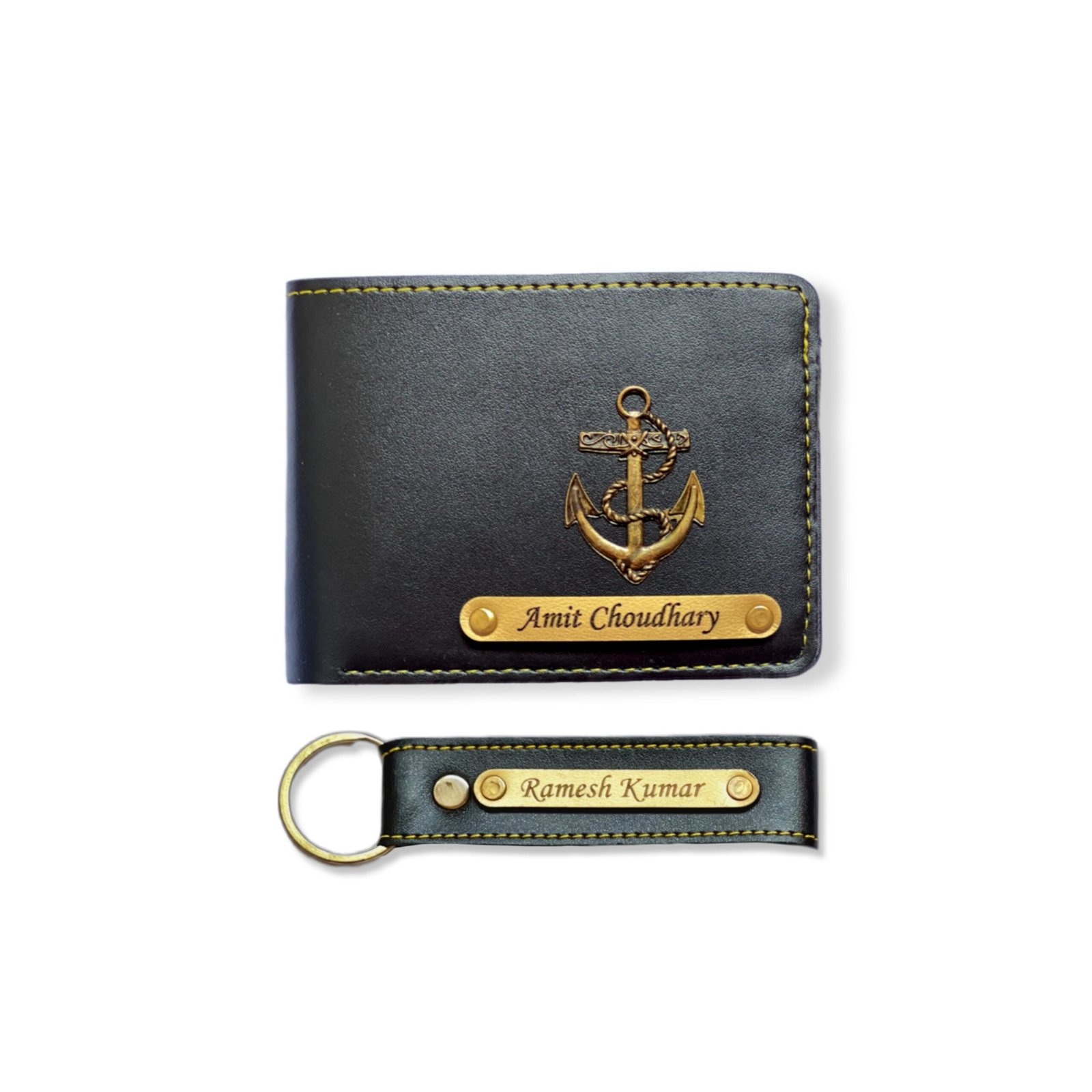 Q: How do I customize each item in the Personalized Men’s Wallet Keychain set? A: During the ordering process, you’ll have the option to enter the names, initials, or short messages you want to be engraved on each item. You can also choose your preferred color.