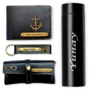 The Premium 4-in-1 Gift Hamper is an elegant and practical corporate gift, featuring a premium Croco-textured wallet, a durable 750 ml stainless steel bottle, a sleek metal ball pen, and a long plate hook keychain. This sophisticated gift set is perfect for executives, business professionals, and special occasions.